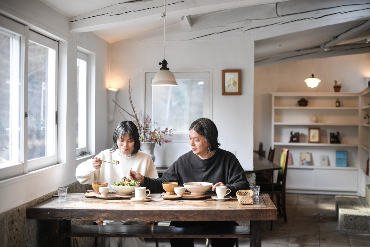 昼時になり食事に訪れた『starnet』は、1998年のオープン以来、地産地消の暮らしを提案し続ける一軒。かつて都内でブランドのプロデュースやギャラリーを手掛けていた故・馬場浩史さんはこの土地に惹かれ、自身の移住を機にこの店を構えた。カフェの料理には店から半径40km圏内で作られるオーガニックな食材を使用し、ギャラリーでは地元の若手作家を支援するなど、その先駆け的な取り組みの数々は、多くの人々に影響を与えてきた。「馬場さんの物づくりや店づくりのスタンスや生き方に、いまも尊敬を抱いています」。ただ、空腹を満たすだけでない、食の本当の価値やレストランのあり方に立ち返る。この店に流れるゆったりとした時間と癒しの空間に、原点回帰する二人だった。