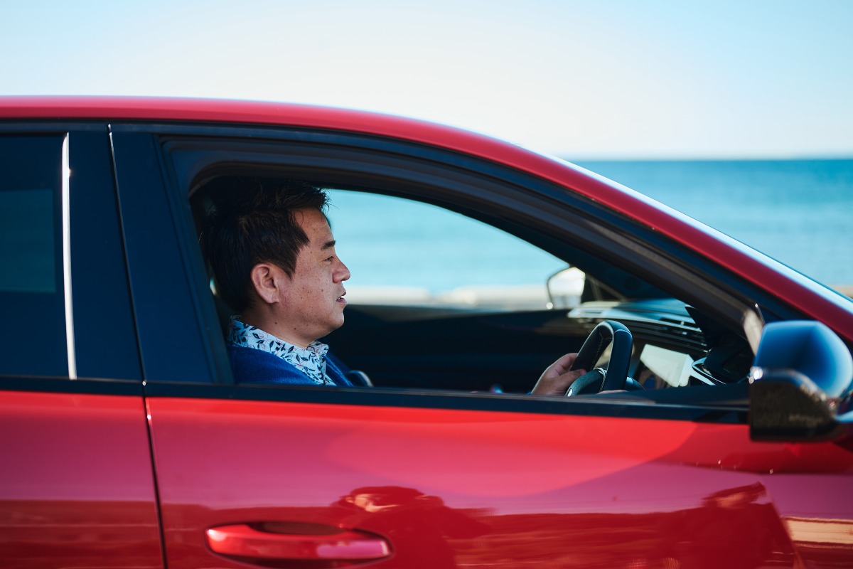 この日、スタートは快晴の七里ヶ浜海岸から。穏やかな海とその先には江の島、そしてまだ雪の残る富士山という絶景が出迎えてくれた。「僕は赤い車が好きで、長年乗り換えてきましたが、プジョーの赤は深い色味にシックなメタリック感もあって、青空にも生えますね」。
