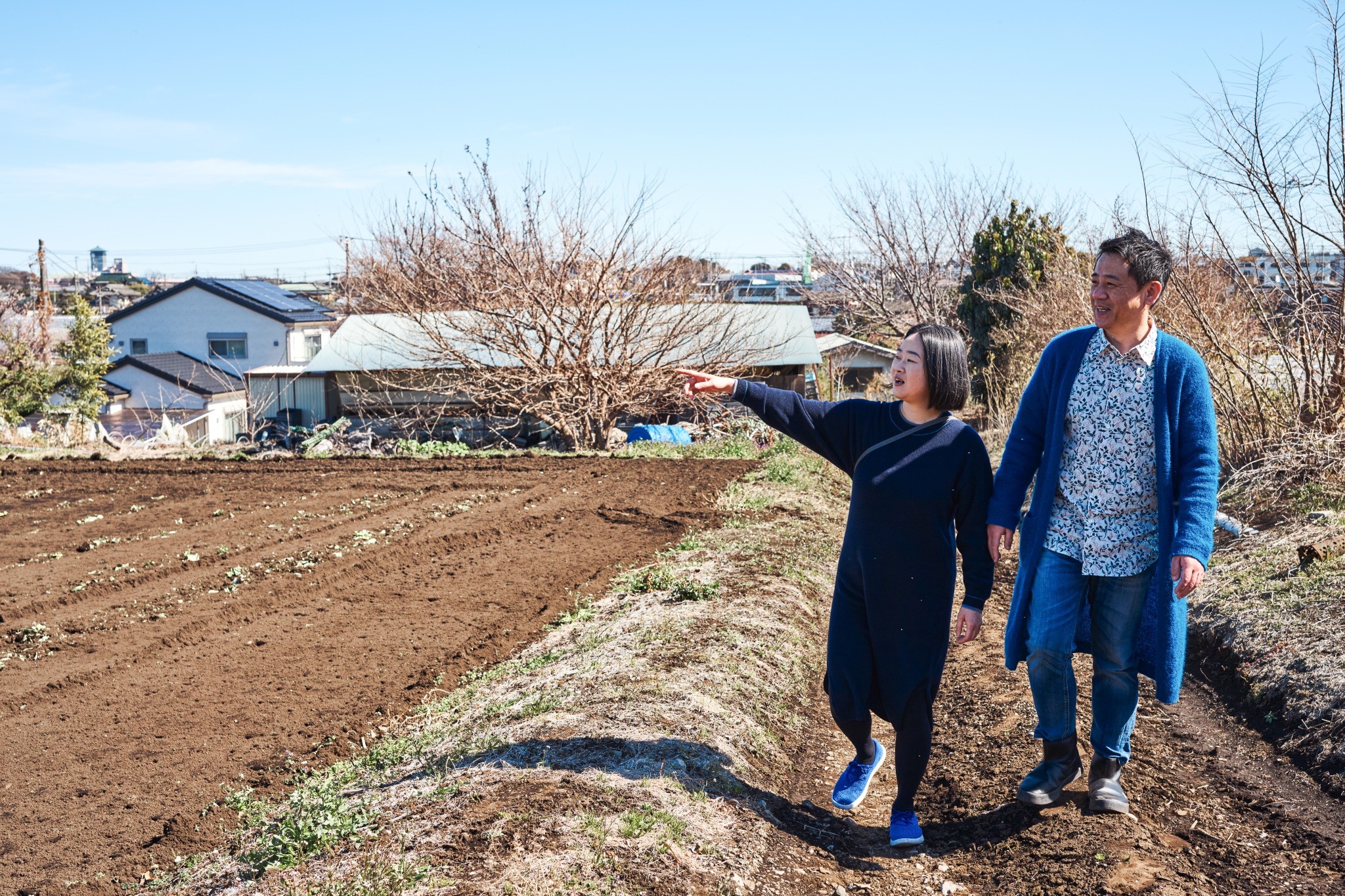 広大な農地と豊かな自然に囲まれ童心に帰る二人。約3ヘクタールを有する農地では、キャベツやトウモロコシ、枝豆などの露地栽培も行われている。