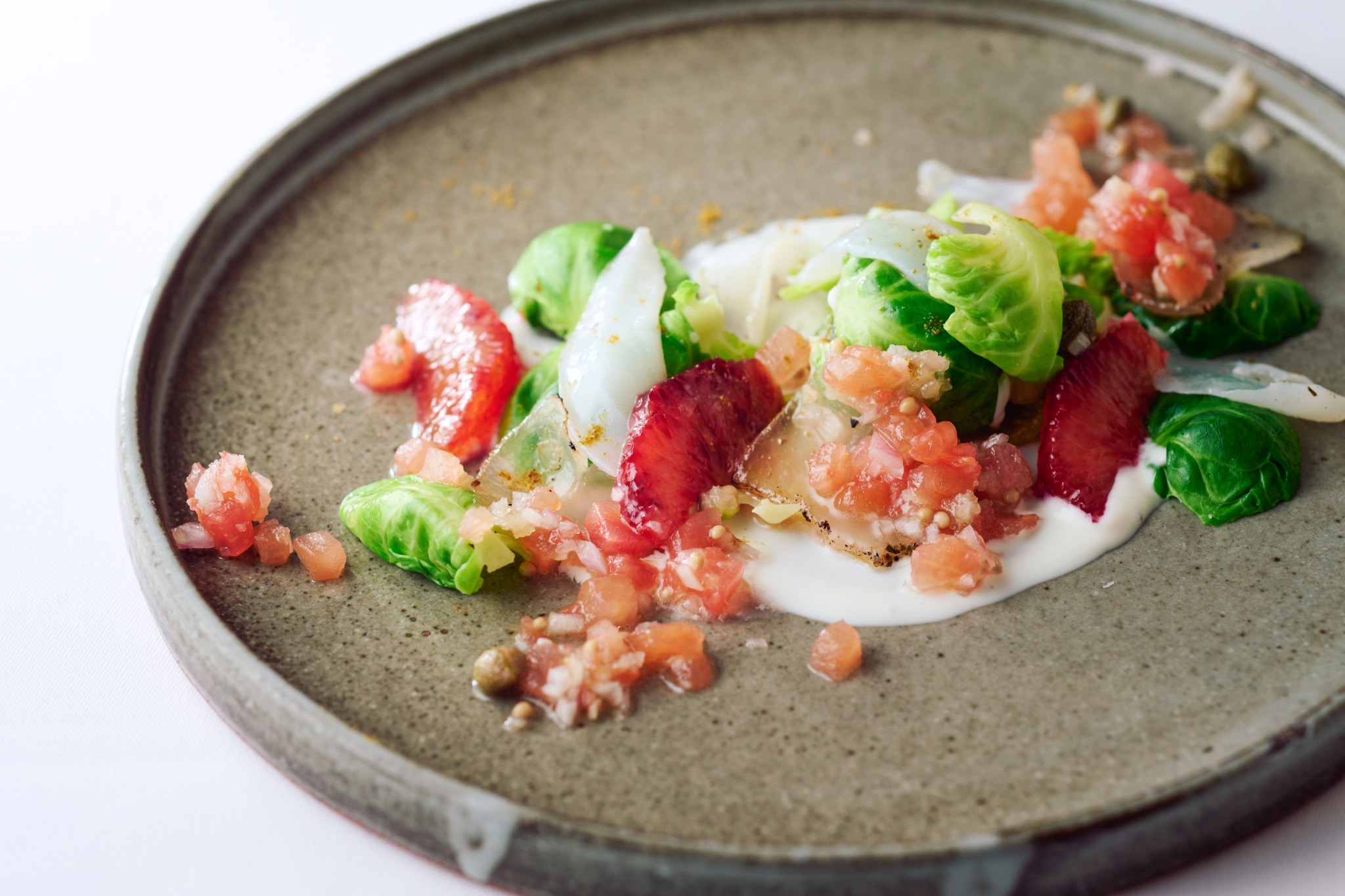 この日の前菜は、「アオリイカ 松阪豚 芽キャベツ」。「炙ったイカとラルド(豚の背脂)が擬態しながらも、海と山の異なる味わいでとても面白いですね」と小笠原シェフ。