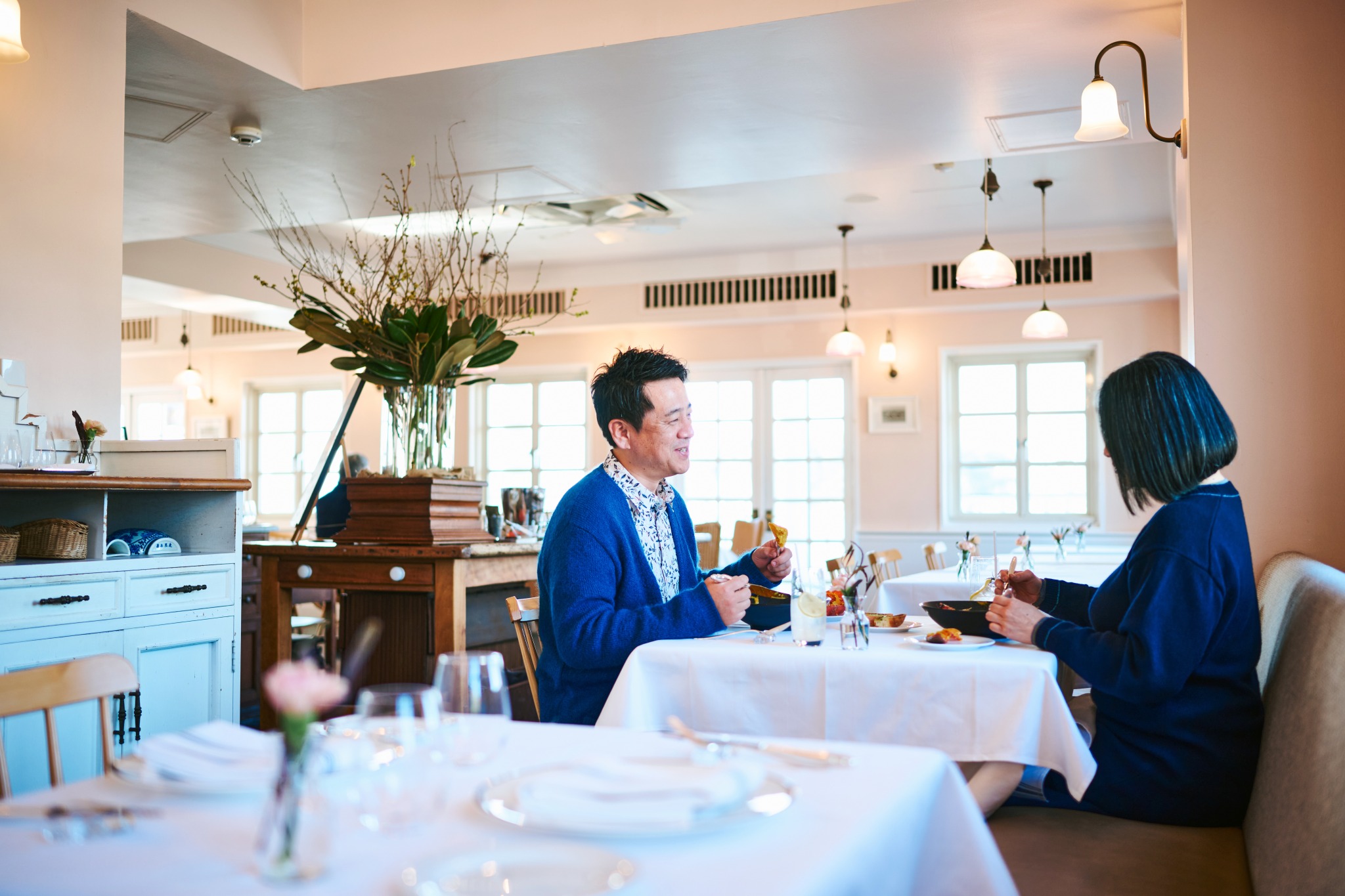湘南らしい風情が味わえる、海辺に佇む白亜の一軒家レストラン。目と鼻の先にある姉妹店『パティスリー ラ・マーレ・ド・チャヤ 葉山本店』にも、夫妻でよく立ち寄るという。