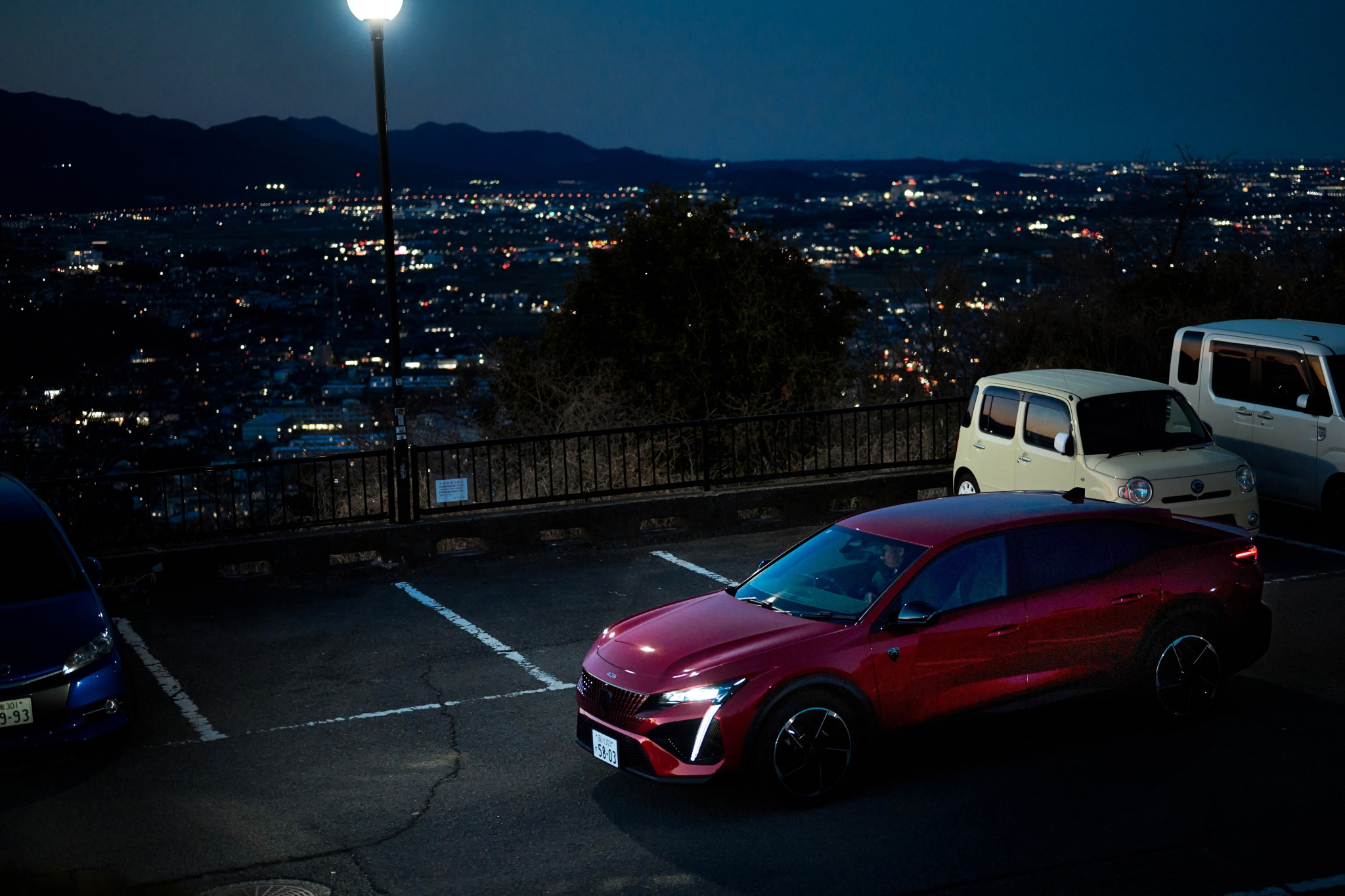 眼下に広がる夜景にも増して輝くデイライトはライオンの牙をモチーフにしたもの。プジョーならではの個性的な意匠が他の車種とは一線を画した魅力を放つ。