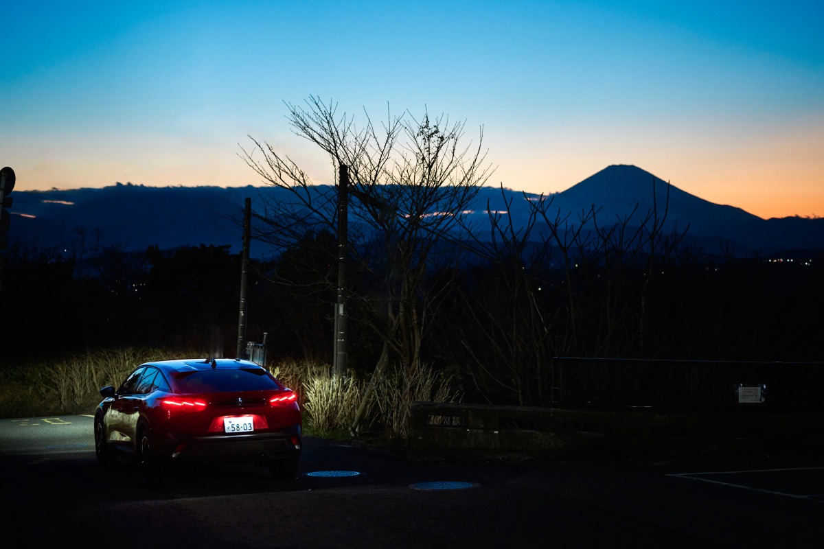 一日を通してドライブを見守ってくれた富士山も、夕闇が次第に深まる中、墨絵のようなシルエットに。シャープなカギ爪型に灯るテールランプも美しい。