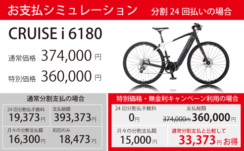 つまり、「春の E-BIKE お得に乗り出そうキャンペーン」期間中に、対象E-BIKEをショッピングクレジット(最大24回払い)で購入すると、「特別価格」での提供と「金利手数料無料」という、二つの特典を同時に享受できる「ダブルでお得」な購入プランが実現する。