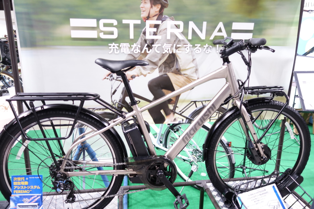 太陽誘電の次世代回生電動アシストシステムFEREMOを搭載した、クロスバイクスタイルの丸石自転車「STERNA」。車輪の回転で充電するので、家庭用電源からの充電なしで1000㎞走れるという。日常的な使用なら、ほぼ充電なしで運用できるというのがスゴい。積載力高め&スタイリッシュなフォルムで人気が出そう。
