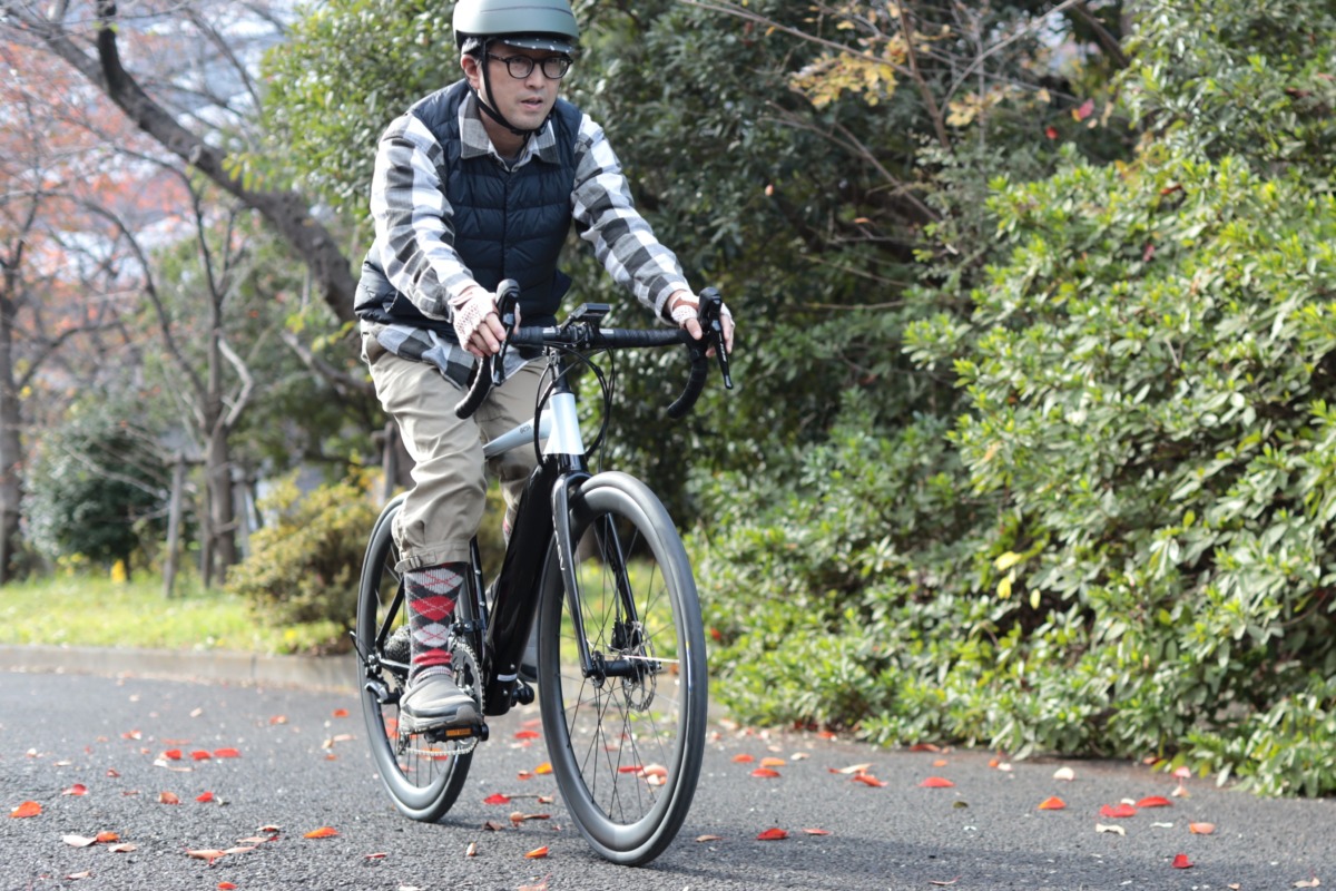 一方で、ほんの少し重量感がある。またQファクター(ペダルの踏み幅)がちょっと広く感じられた。これは、クロスバイクなどフラットバーではなく、ロードバイクのポジションだからより気になるのかもしれない。
