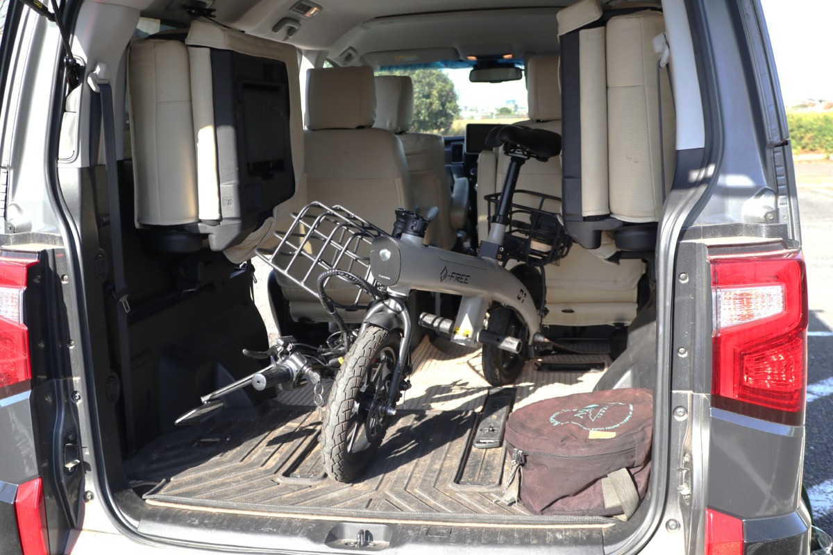 e-FREE 01をクルマに積んだシーン。走行可能距離は、30㎞ほどなので、現地までは10㎞以上離れているなら、クルマが現実的だ。車載の際は、ベルトなどでバイクをしっかり固定してから運転しよう。