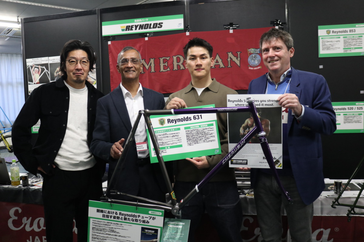 競輪界のスーパースター・太田海也選手と実戦で使用するレイノルズチューブを採用した、ケルビム製競輪フレーム。写真左は製作した今野真一ビルダー。太田選手の左はレイノルズ社長のキース氏、右が専務のジム氏