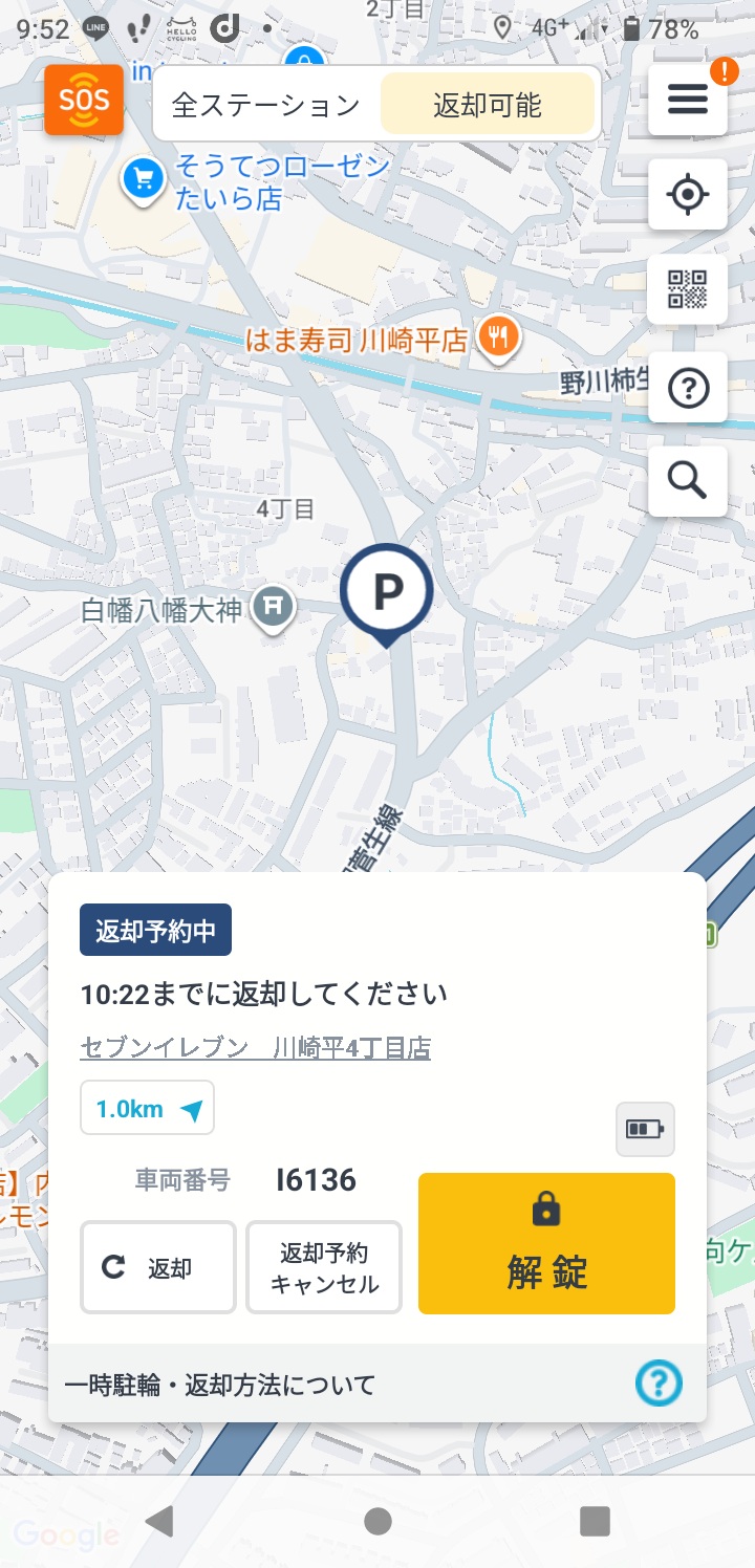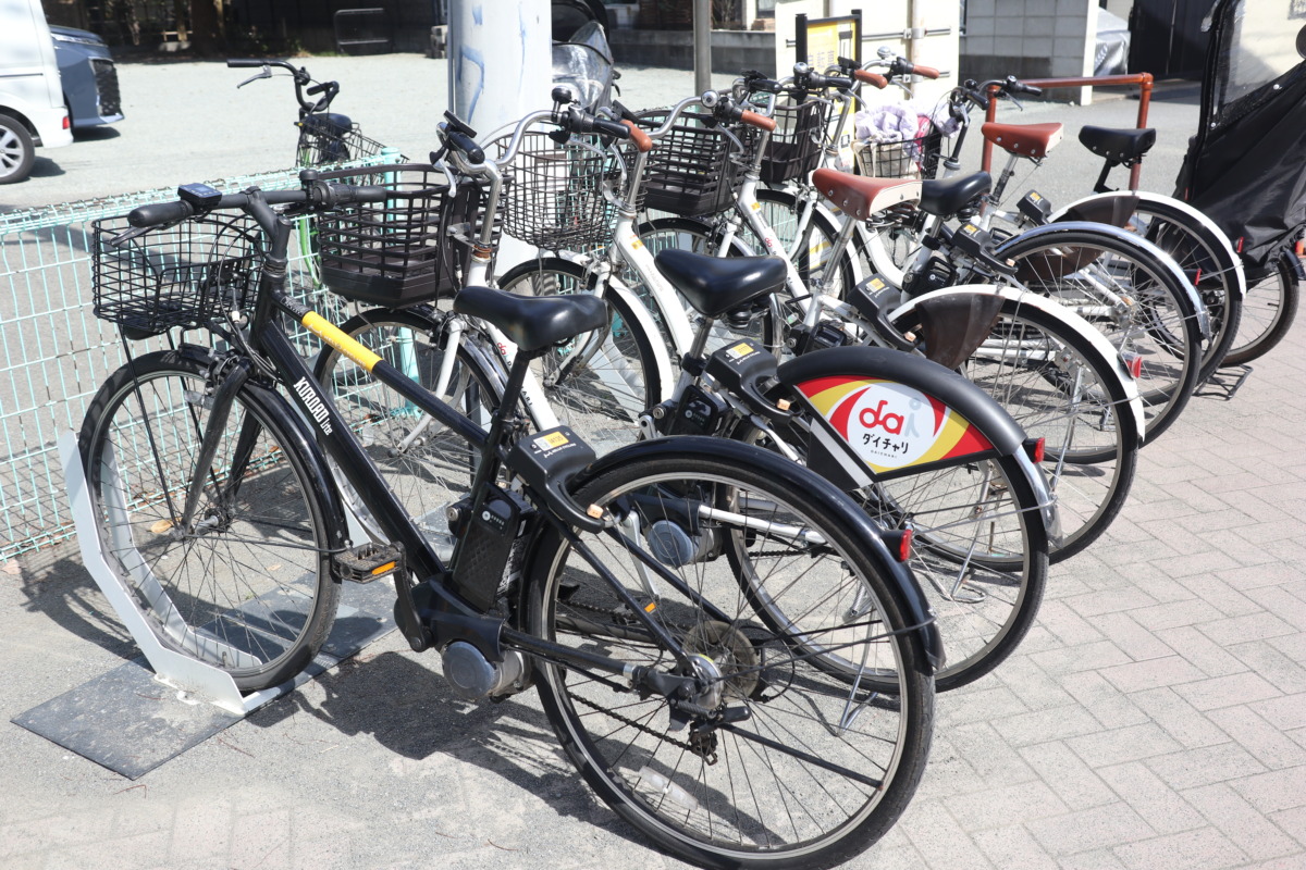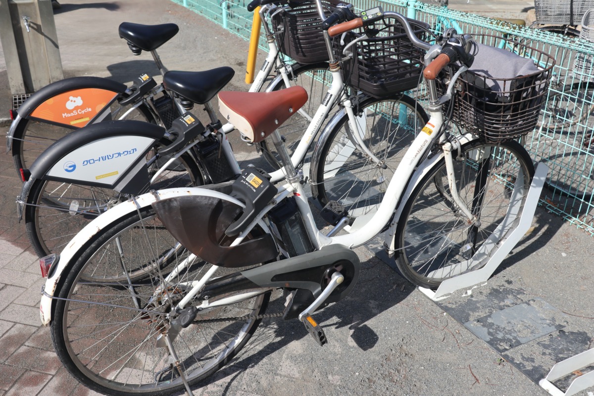 コンビニに設置されたポート。ウォーキングのスタートにもっとも近いところは、満車で停められず。なんとか一つだけ開いていたスペースを予約で確保した。あまり使われてないエリアだと、行った先の満車問題があるので要注意。ここまで、30分を切って160円でHELLO CYCLING移動完了。