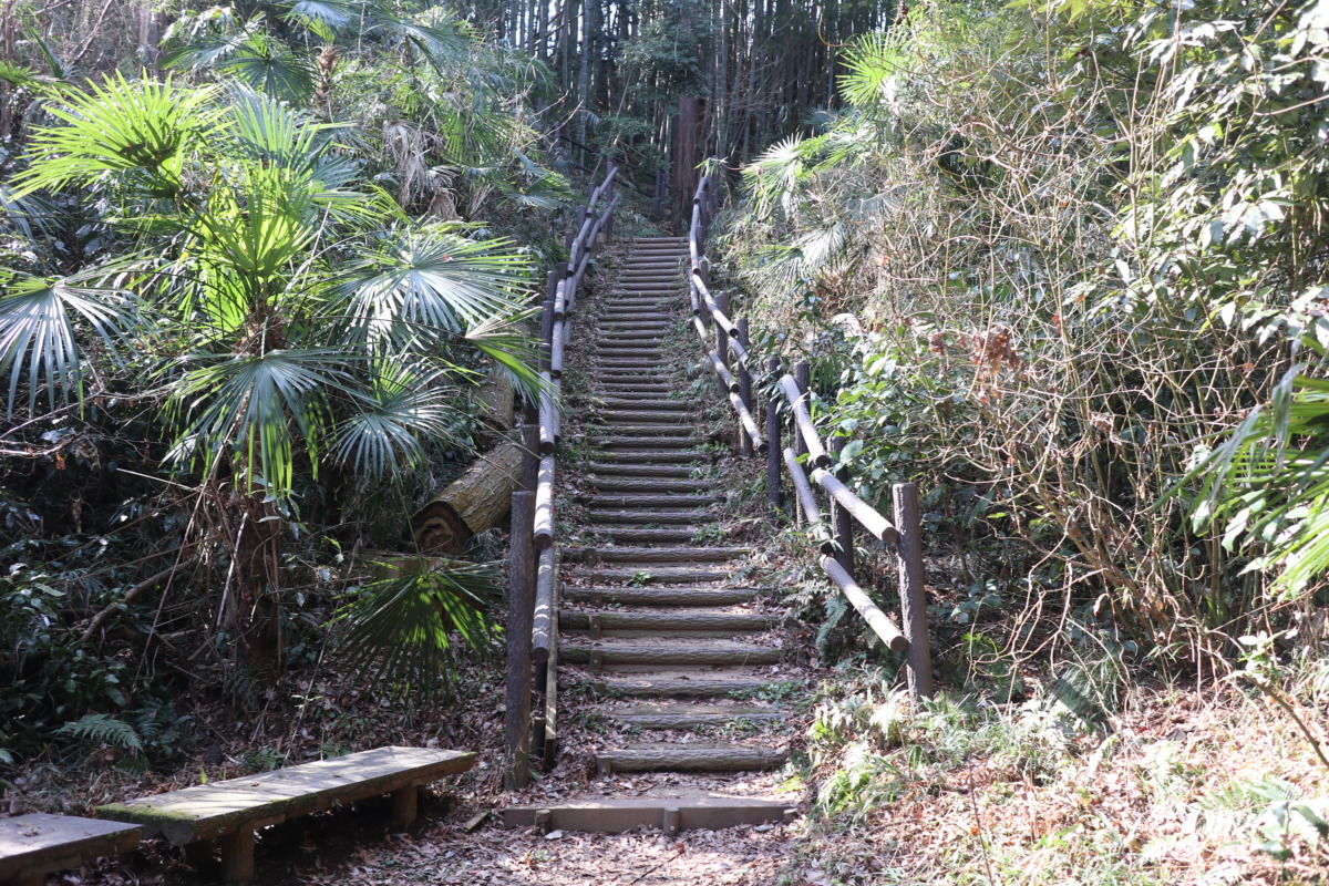 長く続く階段。摩丘陵特有のアップダウンがあり、ウォーキングコースとしてはほどよい負荷。登りきると少し汗ばむくらいで、健康運動としてもちょうどいい。