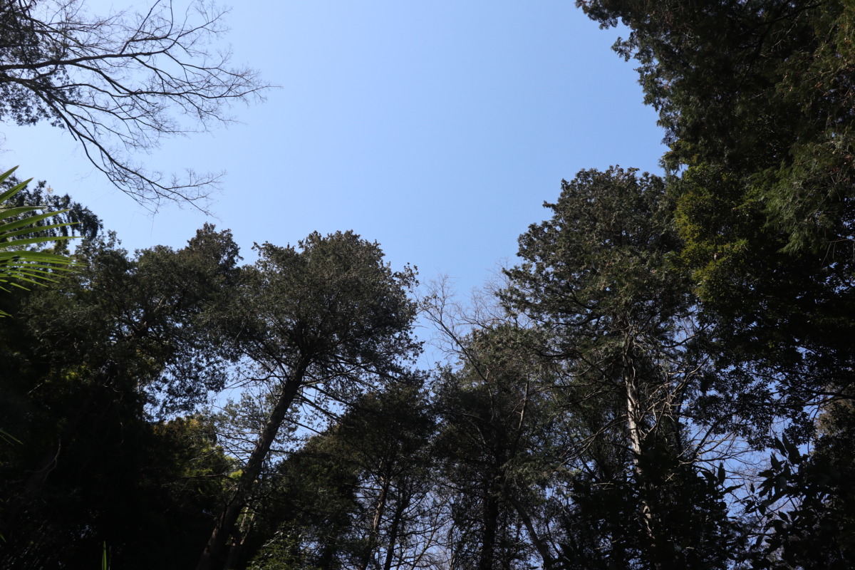 森の中で空を見上げると、枝葉の間から青空が広がる。住宅地から少し移動しただけで、こんな静かな場所に来られるのは、なかなかすばらしいと思う。