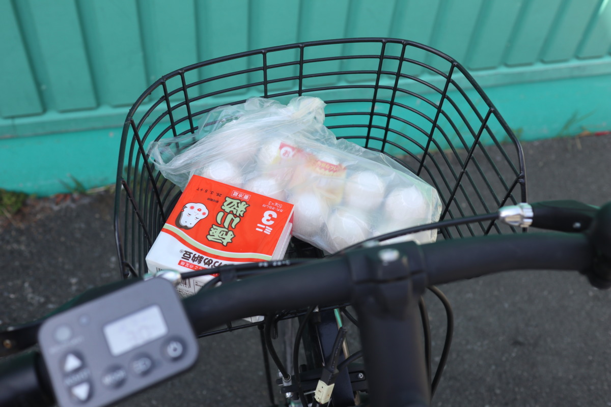 帰り道にスーパーへ立ち寄り、買い物をカゴへ。スポーツタイプの電動アシスト自転車だけど、前カゴが付いているので買い物にも使いやすい。帰りは、専修大学からの激坂を下っていたら卵の8割が割れてしまった。なので、夕飯は巨大なオムレツに。