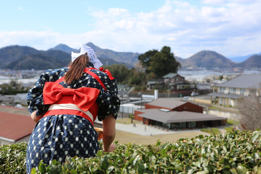 静岡の名産であるお茶の摘み取り体験。かすりの着物を着用し新茶摘みという貴重な体験。韮山反射炉と富士山という2つの世界遺産を見ながらの茶摘み体験は記憶に残ること間違いなし。
