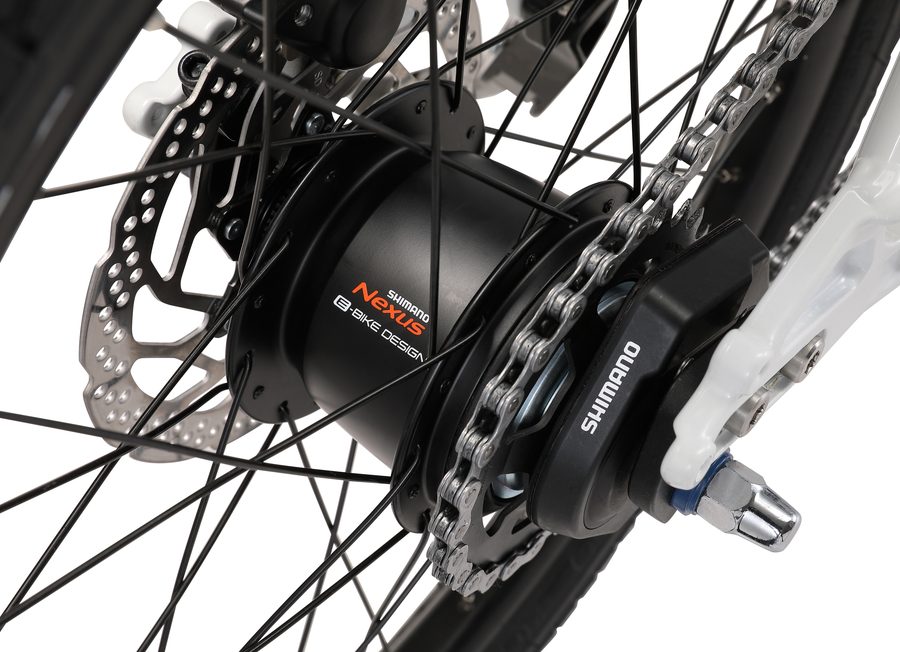 ドライブユニットはシティライドからツーリングまで幅広いフィールドをカバーできるSHIMANO E5080を採用。走行距離はフル充電でおよそ105km(ECOモード使用時)と必要十分な容量です。変速機能やアシスト機能のコントローラーの役目も担うサイクルコンピューターは小径車のデザインに合わせてコンパクトタイプを採用しているので、コクピットまわりもすっきりとスマートに仕上がっております。乗降性のよいフレームデザインと安定感のあるミッドシップタイプのドライブユニットを搭載することで、幅広い年代の方にE-バイクの楽しさを感じて頂けます。さらに内装5段仕様のINTER5Eでは道路の起伏と走行スピードに合わせてコンピュータ制御による高精度な自動変速が行われるSHIMANO Di2システムを搭載。変速の煩わしさから解放され、ライディングにのみ集中することができます。