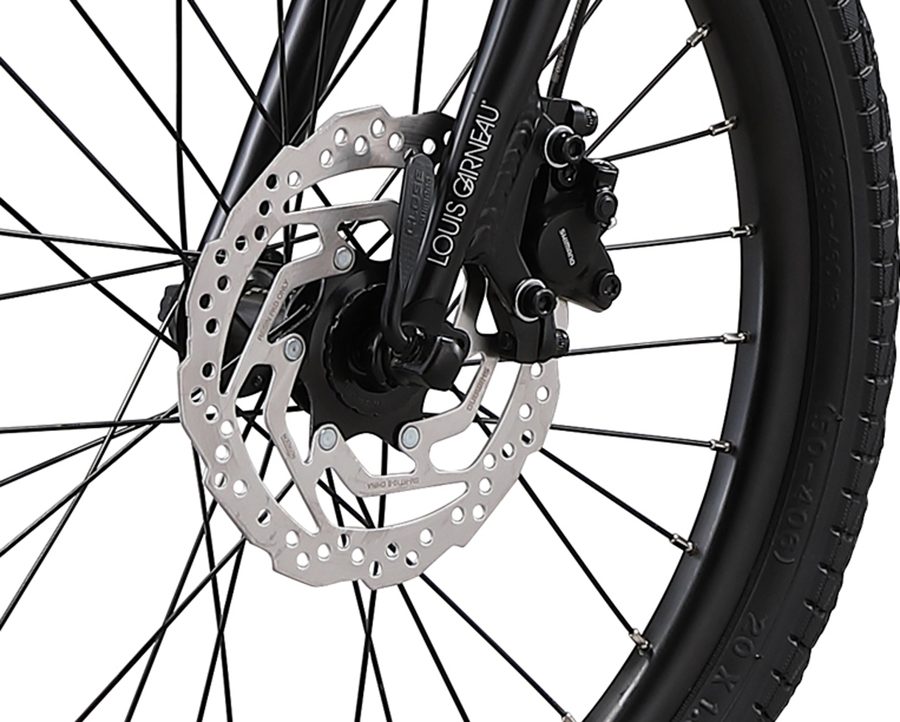 SHIMANO社製の油圧式ディスクブレーキを採用。天候に左右されることなく安定した制動力を発揮する。