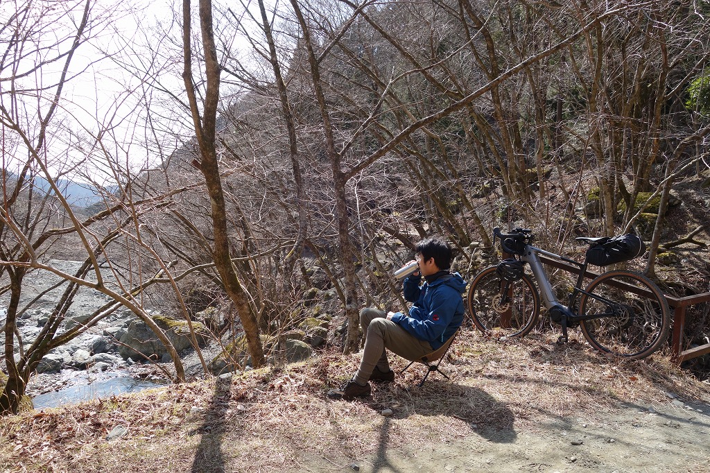 eグラベルロードの本領を発揮できる道をまだ走ってなかったのでもっとも近所と思われる神奈川県内の本格ダートへ。キャノンデールのeバイク、トップストーンネオカーボンレフティ3で林道を走って、渓流の川辺でチェアリング!