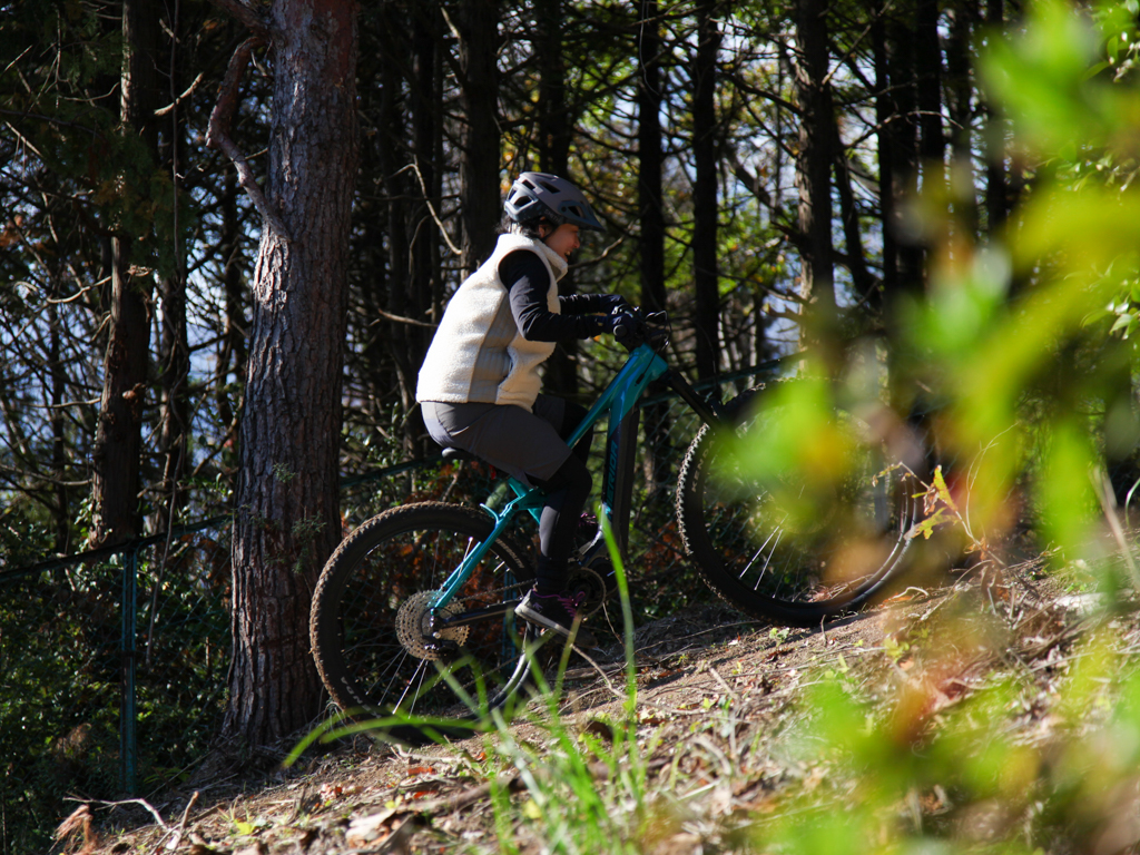 フロントの29インチホイールは、岩が多い下りセクションでも安定感があり、障害物を軽々と乗り越えていきます。一方、リアの27.5インチホイールは、テクニカルなコーナーでの取り回しの良さに貢献し、狭いシングルトラックでも思い通りのラインを描くことができました。