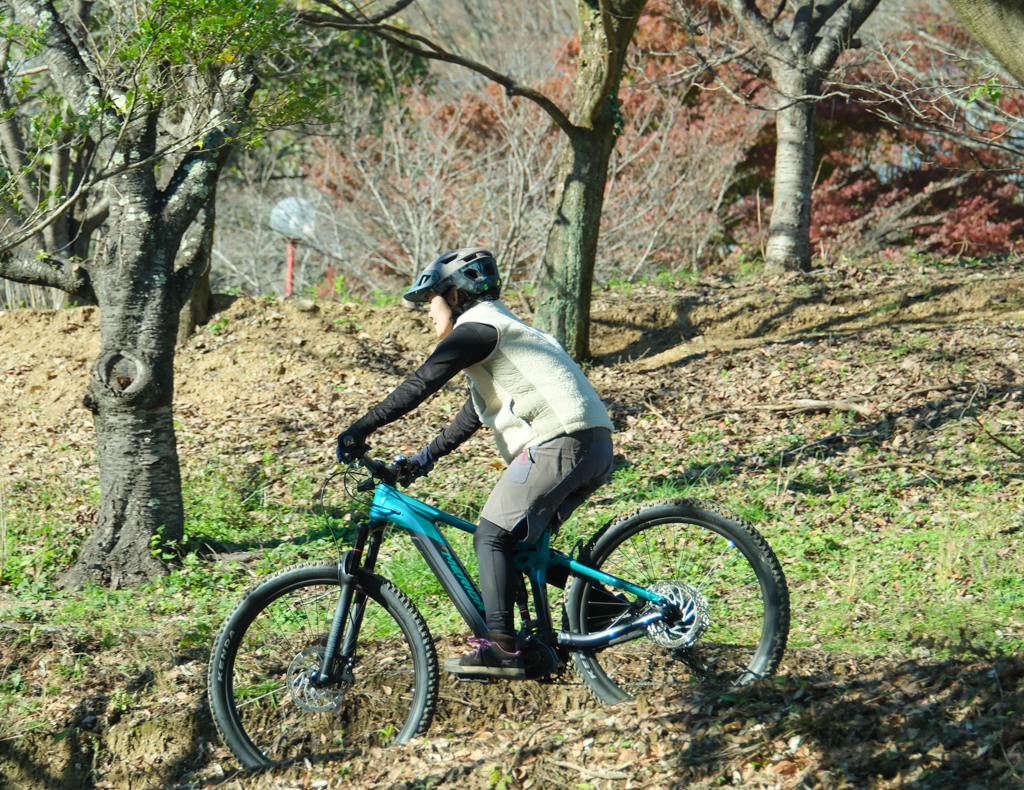 フロントの29インチホイールは、岩が多い下りセクションでも安定感があり、障害物を軽々と乗り越えていきます。一方、リアの27.5インチホイールは、テクニカルなコーナーでの取り回しの良さに貢献し、狭いシングルトラックでも思い通りのラインを描くことができました。