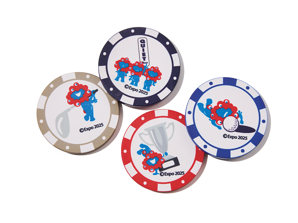 どの絵柄、カラーを選ぶか迷ってしまうカジノチップマーカー。4種類の『ミャクミャク』デザインでグリーン映え確実。各1,100円