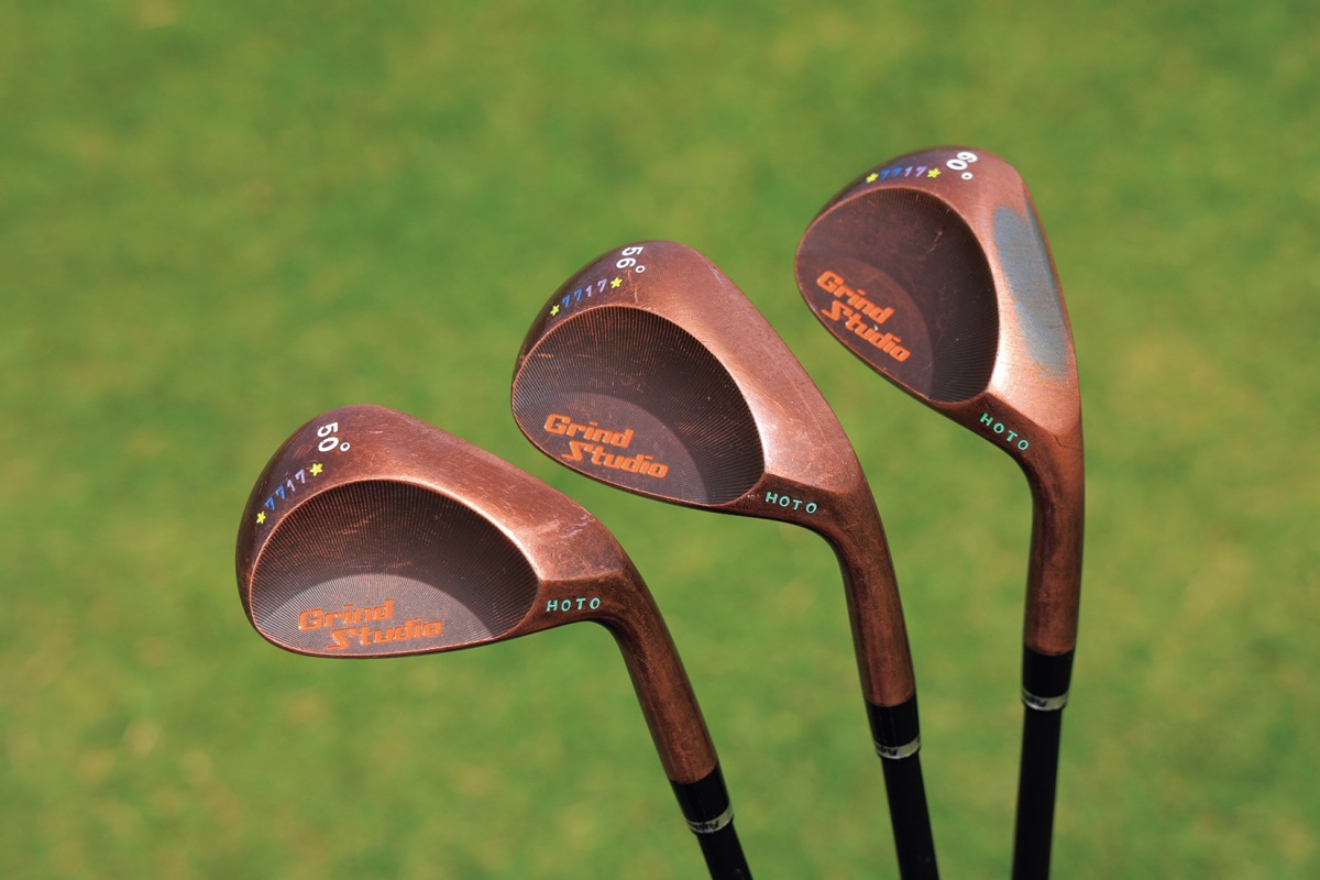 3本体制のウェッジは、クラブメーカーで開発担当を務め、その後自身のブランドを立ち上げた都丸和寛氏のヘッドパーツブランド「GrindStudio」を使用。「HOTO」のスタンプでカスタマイズされている。