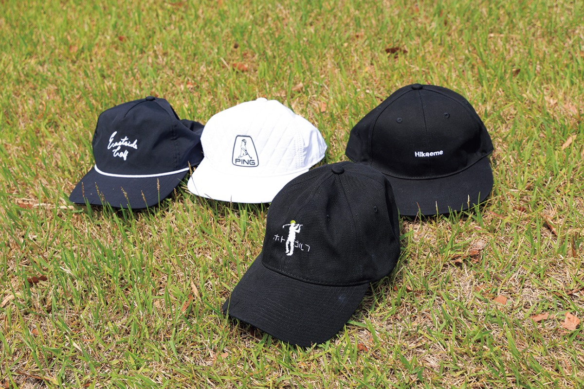 ゴルフを始めてから被るようになったというフラットビルを中心にキャップを蒐集。写真奥左から「Eastside Golf」、「PING」、「rough\&swell」。手前は“刺繍芸人”グッドウォーキン上田氏がホトゴルフを手刺繍で施したキャップ。
