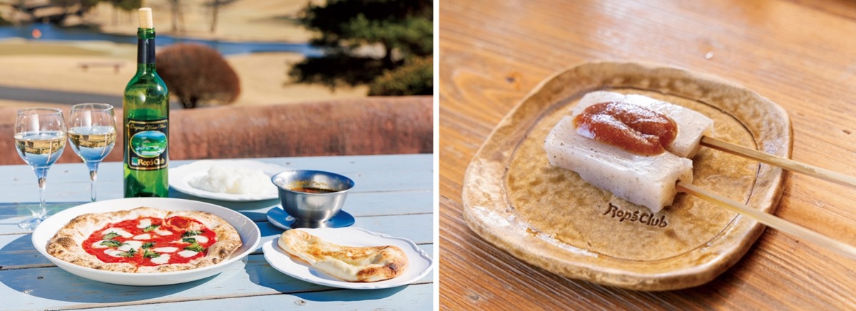 レンガ色を基調としたサンタフェムードあふれるレストランはテラス席も完備。支配人のおすすめは、石窯で焼いた自慢のピッツァ「マルゲリータ」とペアリングしたワイン。焼きたてナンが絶品の「ビーフカレー」も人気が高い。コース内売店では「味噌おでん」を提供している。