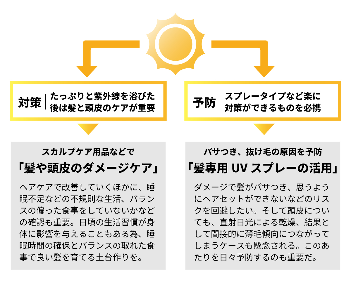 まず、ステップ1としては「髪や頭皮の日焼け止め。日傘やキャップを使うなど、極力紫外線を浴びないようにすることが大事です」と、伊藤さん。そしてステップ2の頭皮ケアは「日々の汚れはきちんと落として、頭皮の毛穴づまりを解消する」ことである。