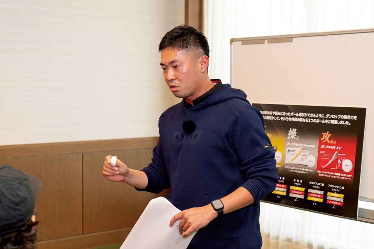 まずはコンペルームに集合して、ダンロップスポーツマーケティングの担当者から『スリクソンZ-STAR』シリーズの開発背景や製品の特徴などについて説明を受ける。普段はなかなか見ることができないボールのカットサンプルも用意され、実際に手に取ってウレタンカバーの薄さ、柔らかさなどを確認した。打つ前から「モデルによってこんなに違いがあるのか」と驚きを隠せない参加者たち。