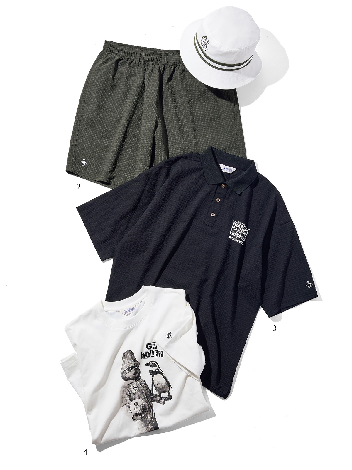1]太番手のオックス素材でヘリ巻き部分上下のパイピングがポイント。バケットハット8,250円 2]3]吸汗性と通気性に優れたメッシュ素材で旅行にも持ち運びが便利な収納袋付き。バックスタイルも両ブランドのアイコンがプリントされた遊び心が溢れていたり、ライフスタイルまで着こなしが楽しめる3点セットアップ。22,000円(カーキ/ブラック展開) 4]フロントにGolfickersでも定番のグラフィックをコラボレーション用にアレンジしたTシャツ。8,800円