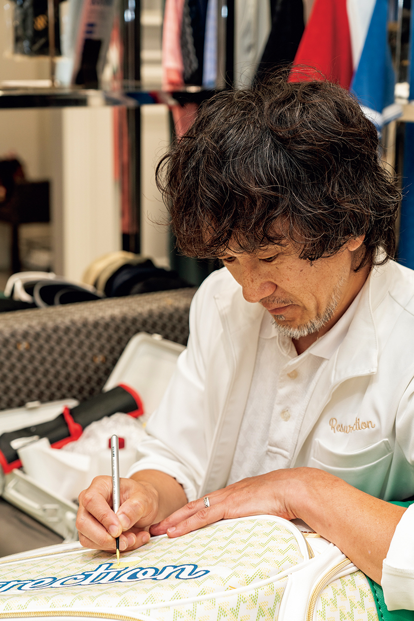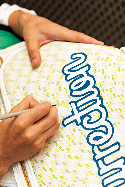 フランスの老舗高級ブランドで同様の職種に従事していた熟練の職人である山崎氏。文字やラインなどのベーシックなものから、イラストや絵柄といった複雑な図柄まで、多様なリクエストに合わせたデザインのペイントを施す。