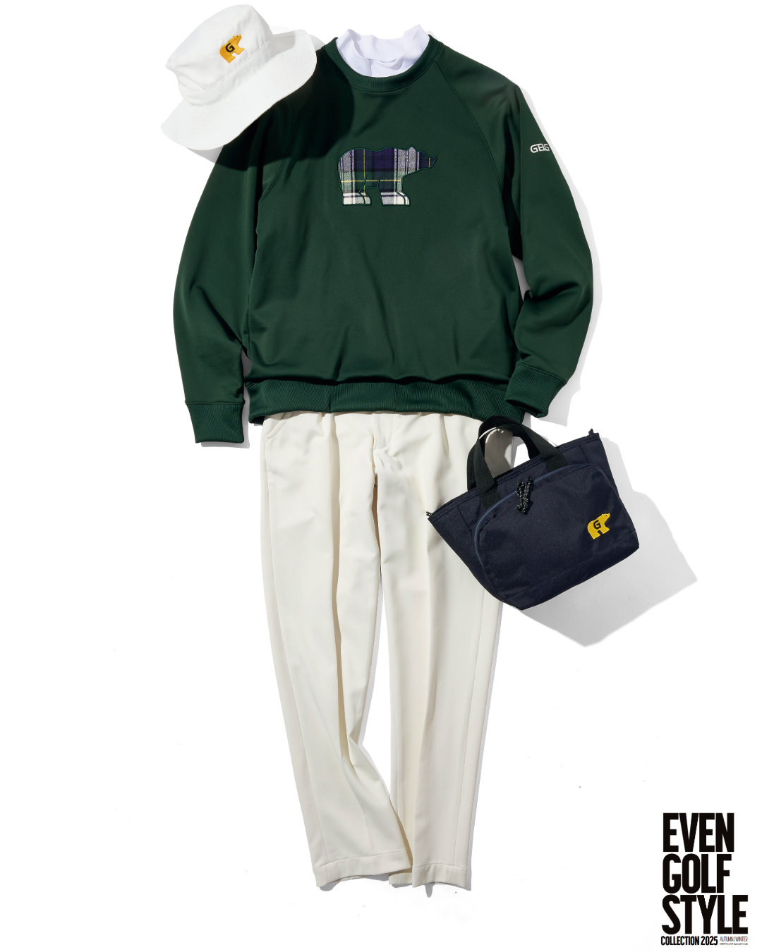 ブランドを象徴するアイコンのクマをフロントに配したスウェットは秋ゴルフのスタイリングに最適なアイテム。軽やかな印象をアップさせるパンツはストレッチ性に優れ、凸凹した裏生地を採用したことによる肌離れの良さも特徴。ハット6,490円、スウェット10,890円、ハイネックTシャツ7,590円、パンツ13,200円、カートバッグ7,590円