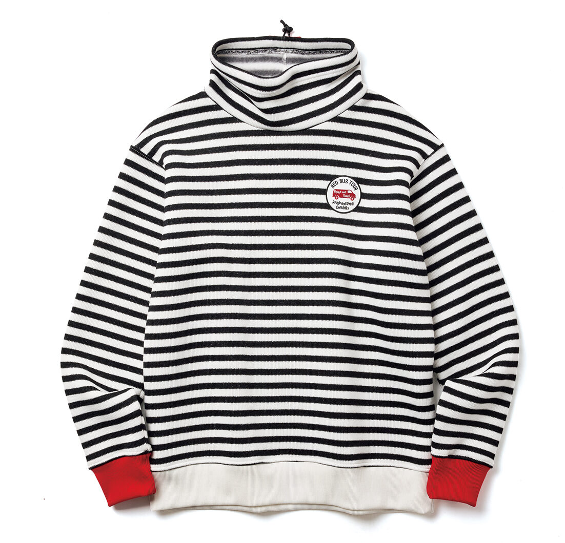 袖口のリブや襟後ろのスピンドル台布に配したレッドが可愛らしいボーダーオフタートル。19,800円