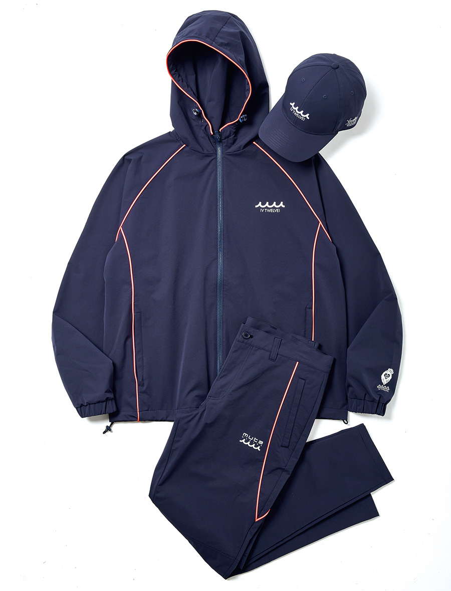 機能性とデザイン性を兼ね備えたブルゾンとパンツのセットアップ。ネイビー、ブラックの2色展開。キャップ11,000円、ブルゾン38,500円、パンツ36,300円