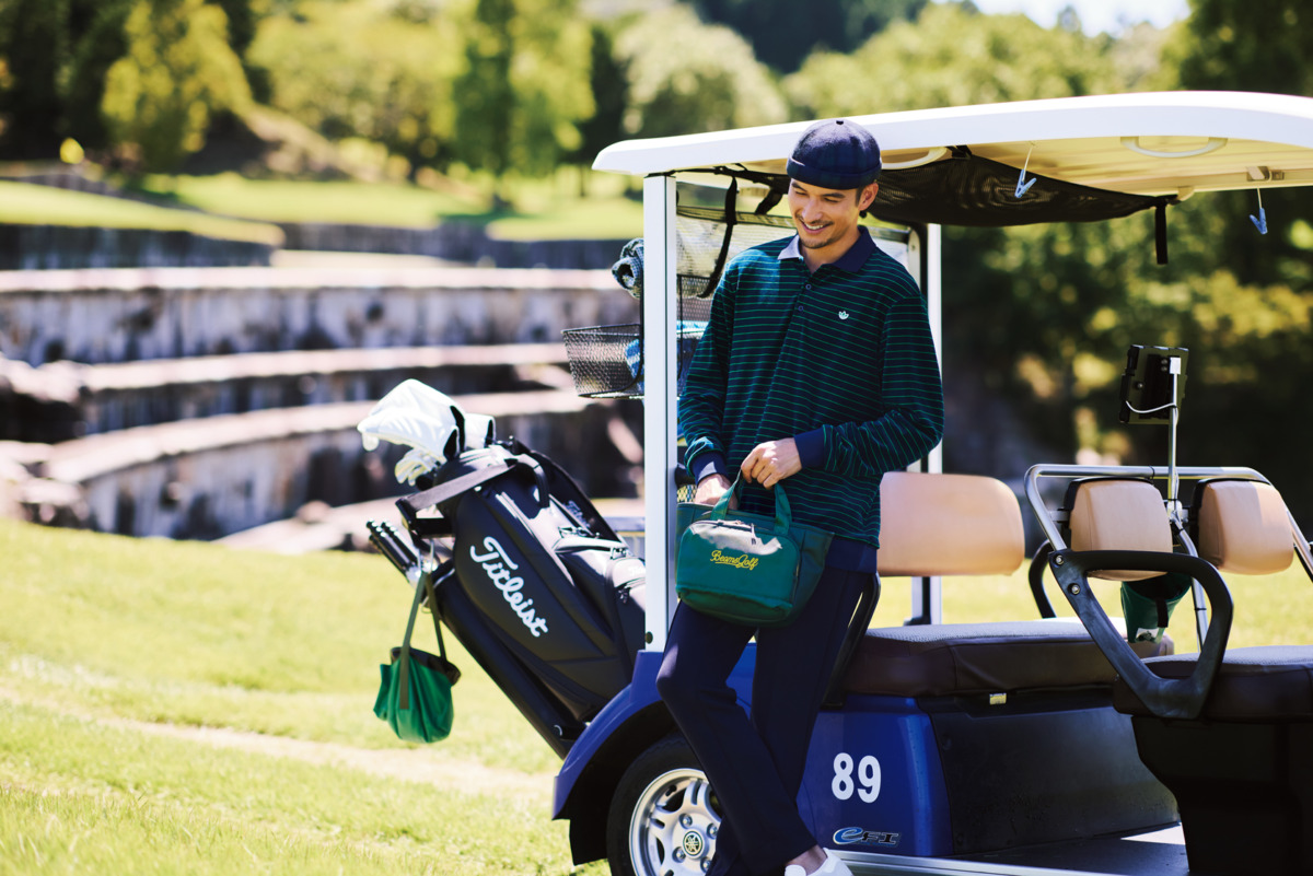 ラウンドトート9,900円(ビームス ゴルフ/問ビームス ゴルフ 有楽町)、キャップ5,280円(ニューエラ/問ニューエラ)、ポロシャツ19,800円、シューズ オープン価格(ともにアディダスゴルフ/問アディダス ゴルフお客様窓口)、パンツ27,500円(TMT CLASSIC/問TMT ジャパン)、キャディバッグ44,000円、ヘッドカバー各4,950円(タイトリスト/問アクシネット ジャパン インク)