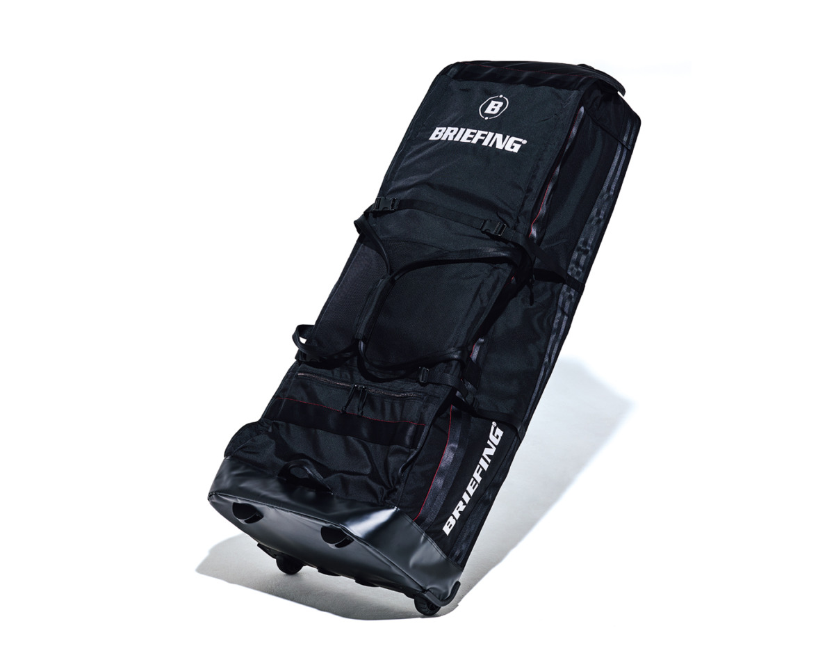 キャディバッグをしっかり固定できるベルト付きカバーは、あらゆるサイズのキャディバッグに対応する。キャディバッグを収納後、空きスペースにシューズ・ウェア類を収納することも可能で、使わないときは2つ折りに収納。176,000円(問ブリーフィング六本木ヒルズ店)