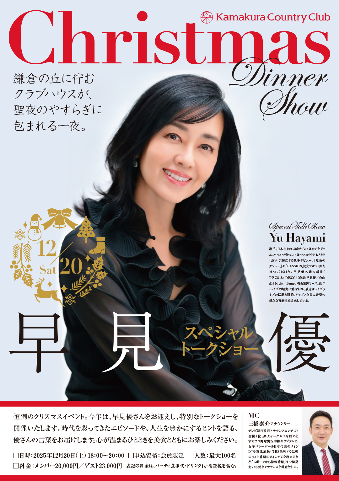 その鎌倉カントリークラブから、この冬の締めくくりにぴったりなニュースが届いた。2025年12月20日(土)、上質な美食と音楽、そして語らいを楽しむ『Christmas Dinner Show 2025』が開催されるという。慌ただしい年の瀬に、静かに心を整える“大人の時間”を過ごせる特別な一夜になりそうだ。