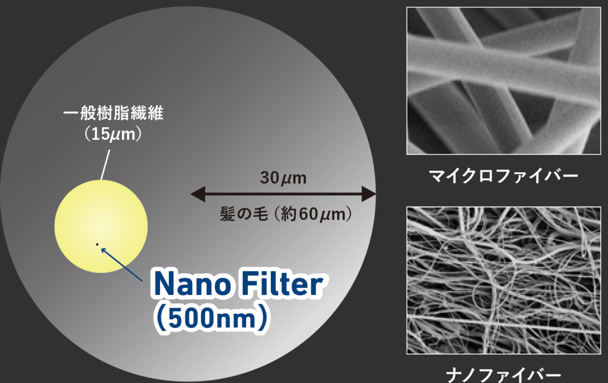 従来のガラス繊維ではなく樹脂の極細繊維ナノファイバーを実現。髪の毛の約1/120、一般的なマイクロファイバーの約1/60の極細繊維をシート状にした技術を実用化。