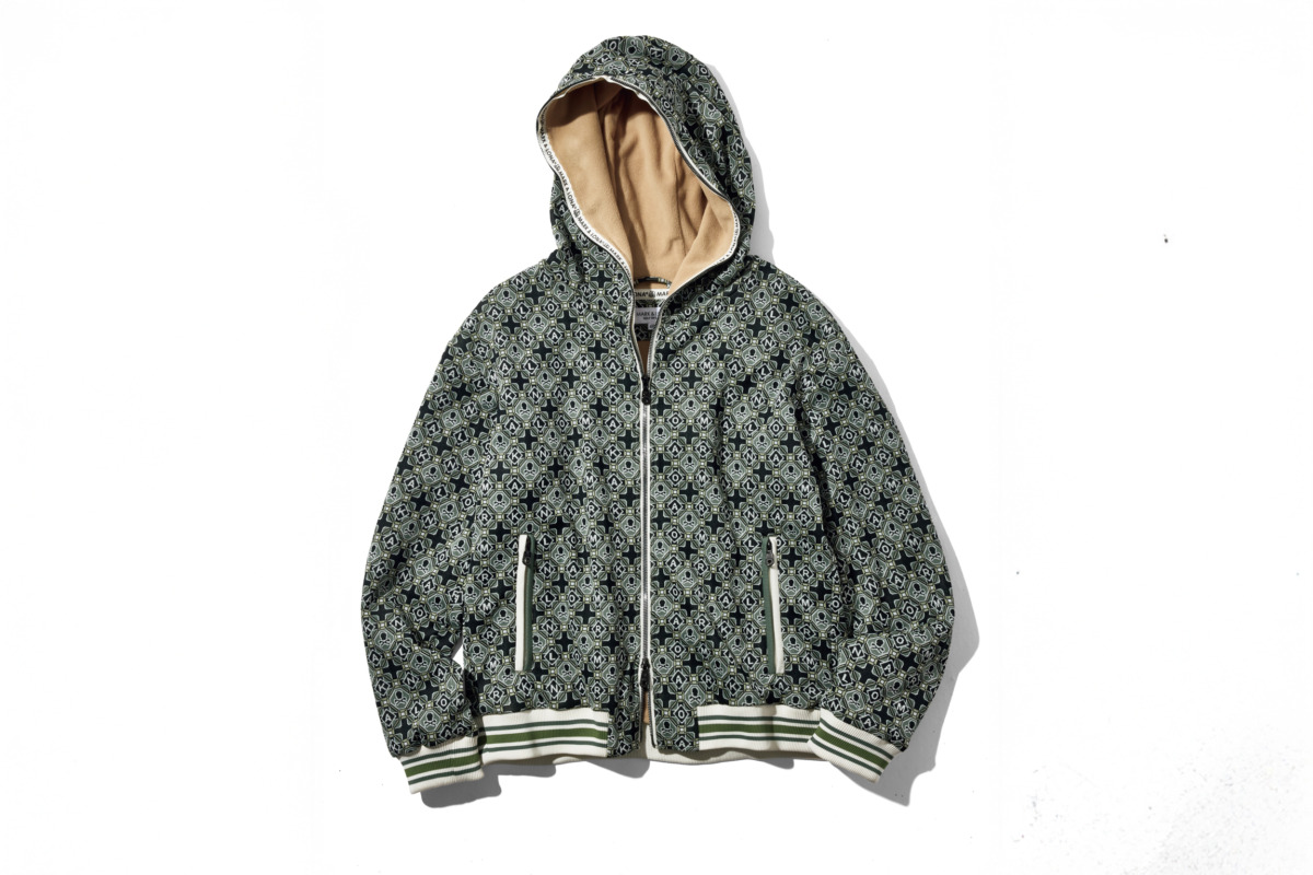 ロゴとクロスの幾何学パターンが存在感を放ち、ジャージ素材の程よいハリと柔らかさ、裏起毛の保温性が魅力。ボーダーのリブや合皮ワッペンもアクセントで、セットアップパンツを合わせればさらに際立つ装いが完成。