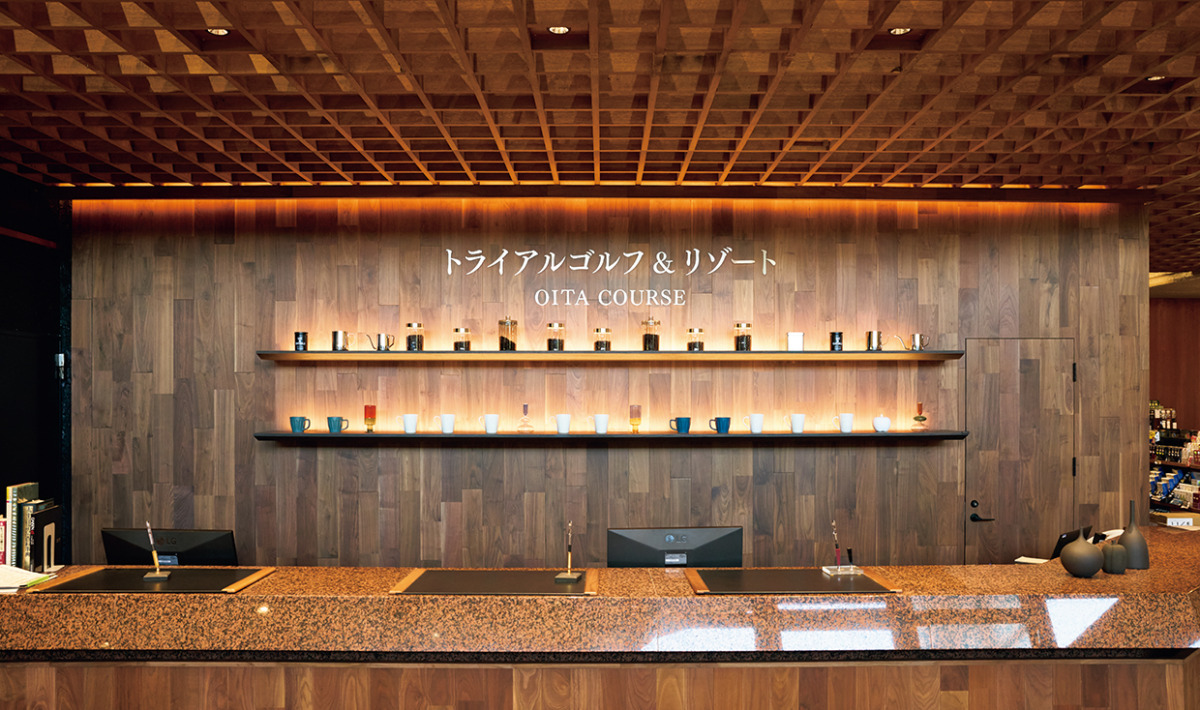 最初に紹介する「トライアルゴルフ&リゾートOITAコース」も、2025年10月にクラブハウスの改修が完了し、リニューアルオープンしたばかりの施設だ。クラブハウスに入ると開口一番、「お洒落!」と内さん。ホテルのような高級感のあるエントランスを抜けると、開放的でカジュアルな空間が広がる。