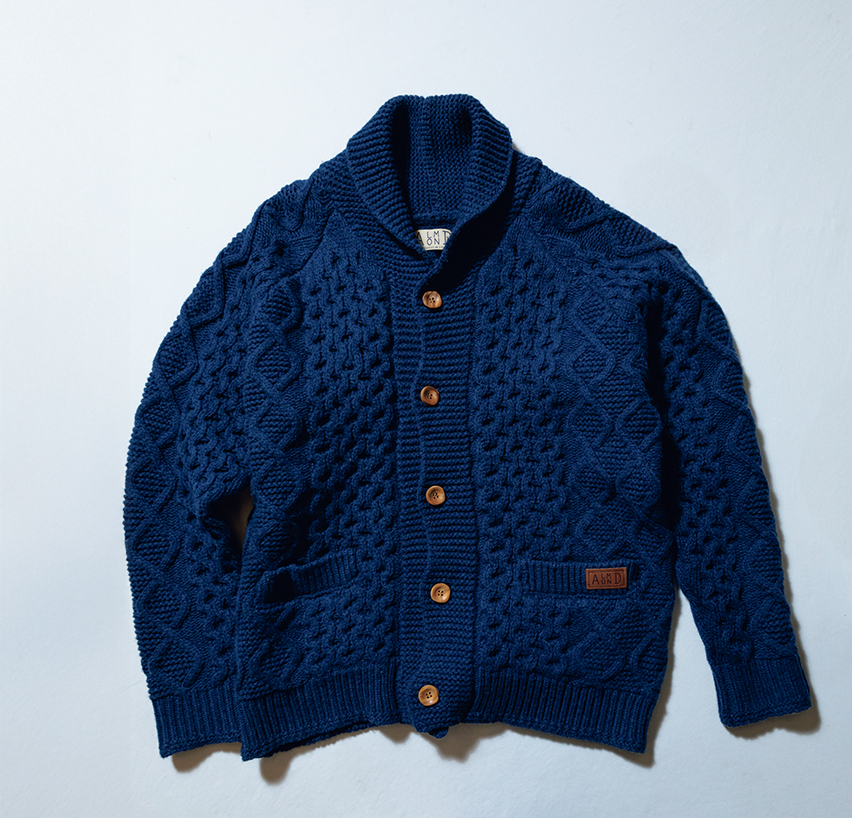 カリフォルニア発のサーフブランド「Almond」のケーブルニットは来場時のジャケットの代替に活用。