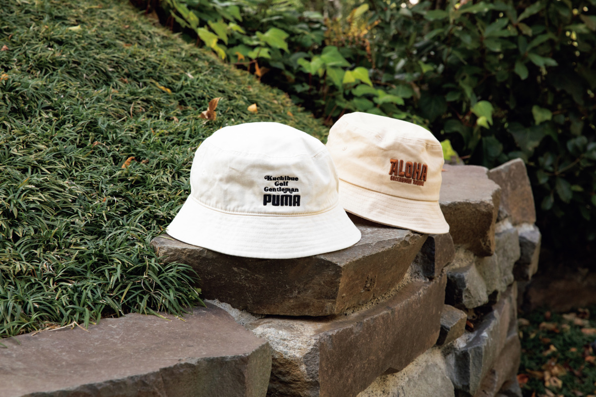 冬ゴルフでもニット帽に替わりバケットハットがお気に入り。左は内側に調整機能を備えた「クチブエ~」と「PUMA」とのコラボ。
