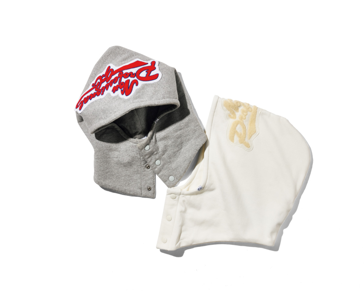 大胆に配した刺繍ロゴがアイコニックな後ろ姿を演出するコットンスヌード。スナップボタン式なので簡単に着脱ができ、自由なアレンジが可能。各12100円(問 three over)