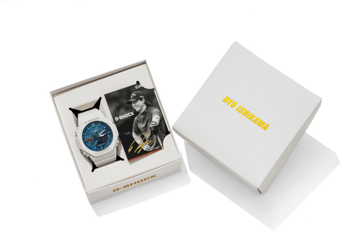 CASIO所属、石川遼選手シグネチャーモデル第5弾。スイング中も邪魔にならない薄型ケース。トレーディングカードが付属。23100円(問 カシオ計算機お客様相談室)