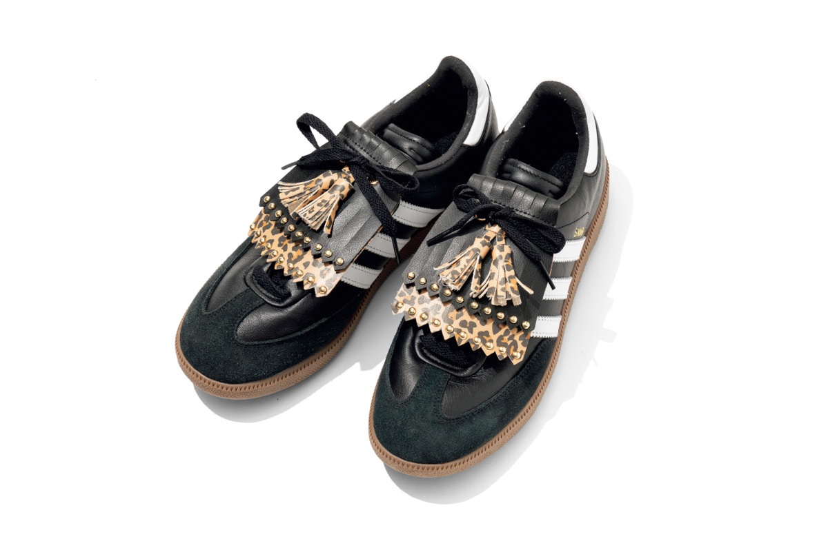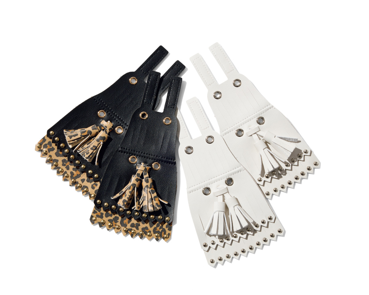 手持ちのゴルフシューズを簡単にオシャレなキルトシューズに変身させられる着脱式のスタッズキルト。(左)Black & Leopard 8800円、(右)WHITE 7700円(問 three over)