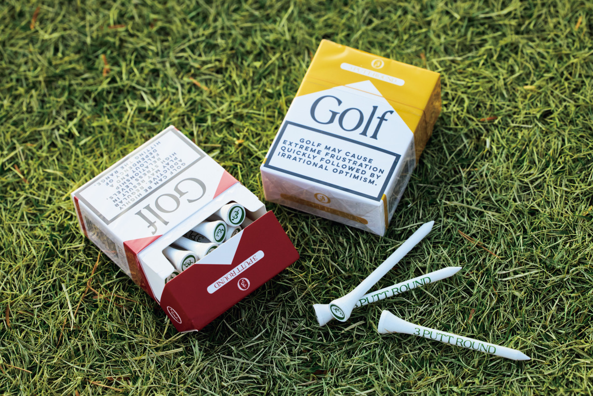 ゴルフにハマりすぎて生活の中心がゴルフ! みたいに、なかなか止められないタバコをモチーフとした、ちょっとシャレの効いた「GOLF ADDICTION TEE PACK」。各2200円(問 マルキ)