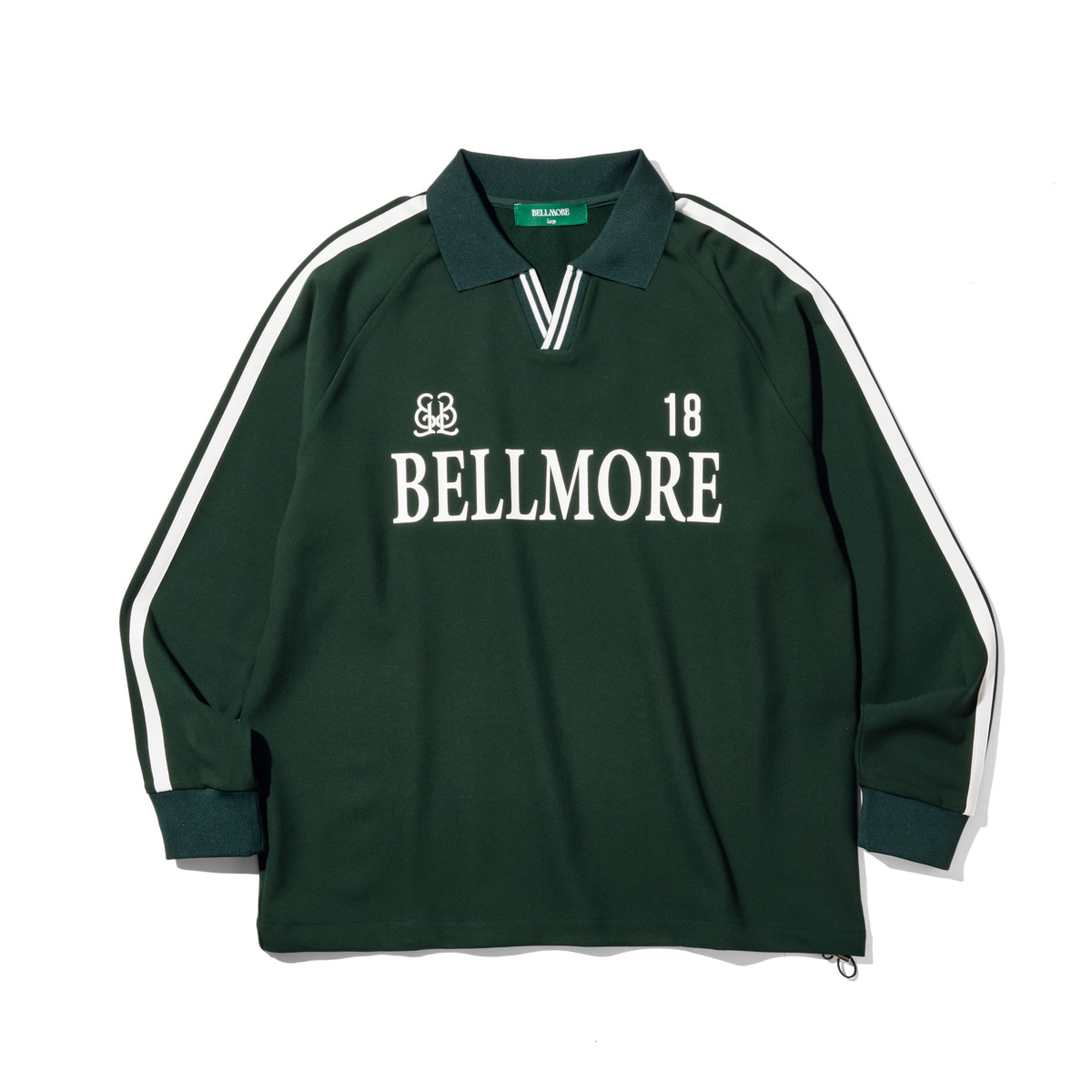 ストレッチ性のある吸湿発熱性に優れた生地を使用したブランド初となるボタンレスの長袖ポロシャツ。袖と襟元に配した2本のライン使いもポイント。29800円