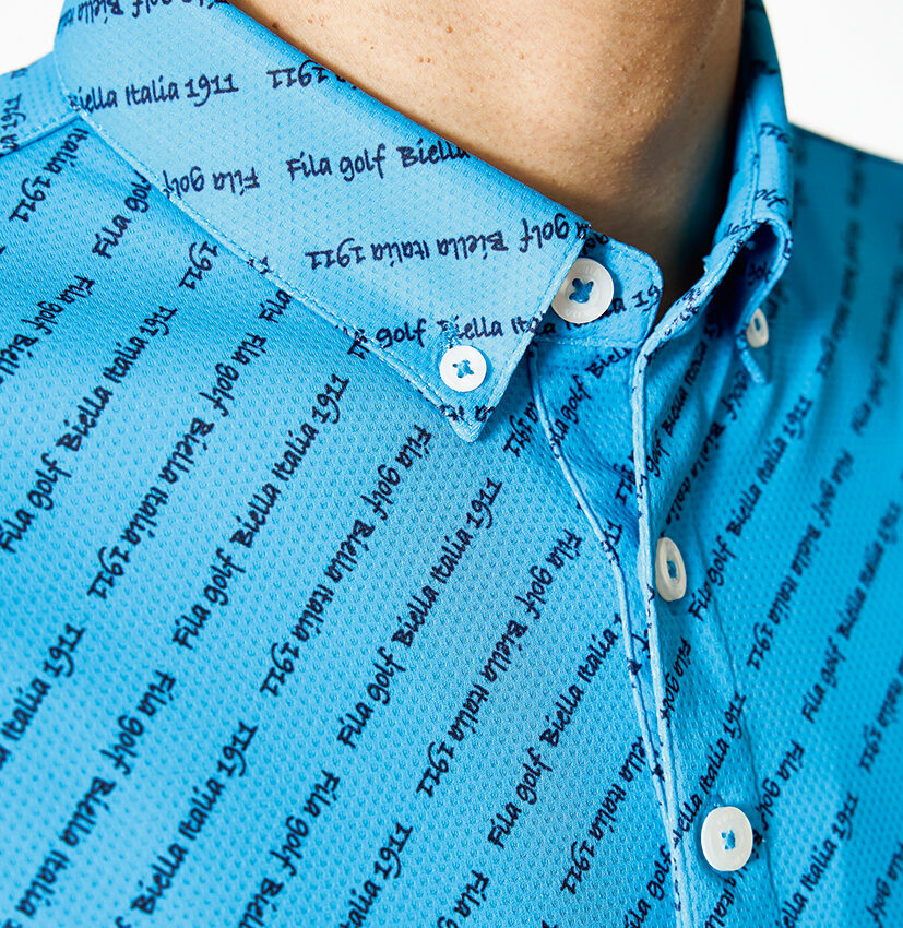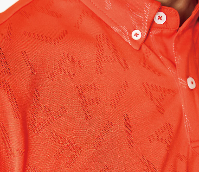 FILAロゴの総柄メッシュジャカード素材を使用したポロシャツはデザイン性に加え、通気性も備える快適な機能性が特徴。