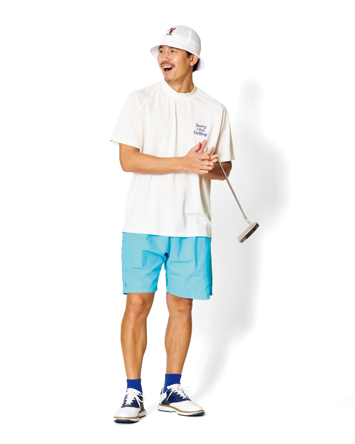 コンパクトなシルエットのメッシュハットをベースに、清涼感のあるブルーと高級感のあるモックネックシャツで、ストリートスタイルにより過ぎないブランドのアイデンティティを上手く落とし込んだカジュアルスタイル。ハット¥8,250、モックネックシャツ¥15,400、ショーツ¥11,000、ソックス¥2,200(すべてペンギンバイマンシングウェア)、その他スタイリスト私物