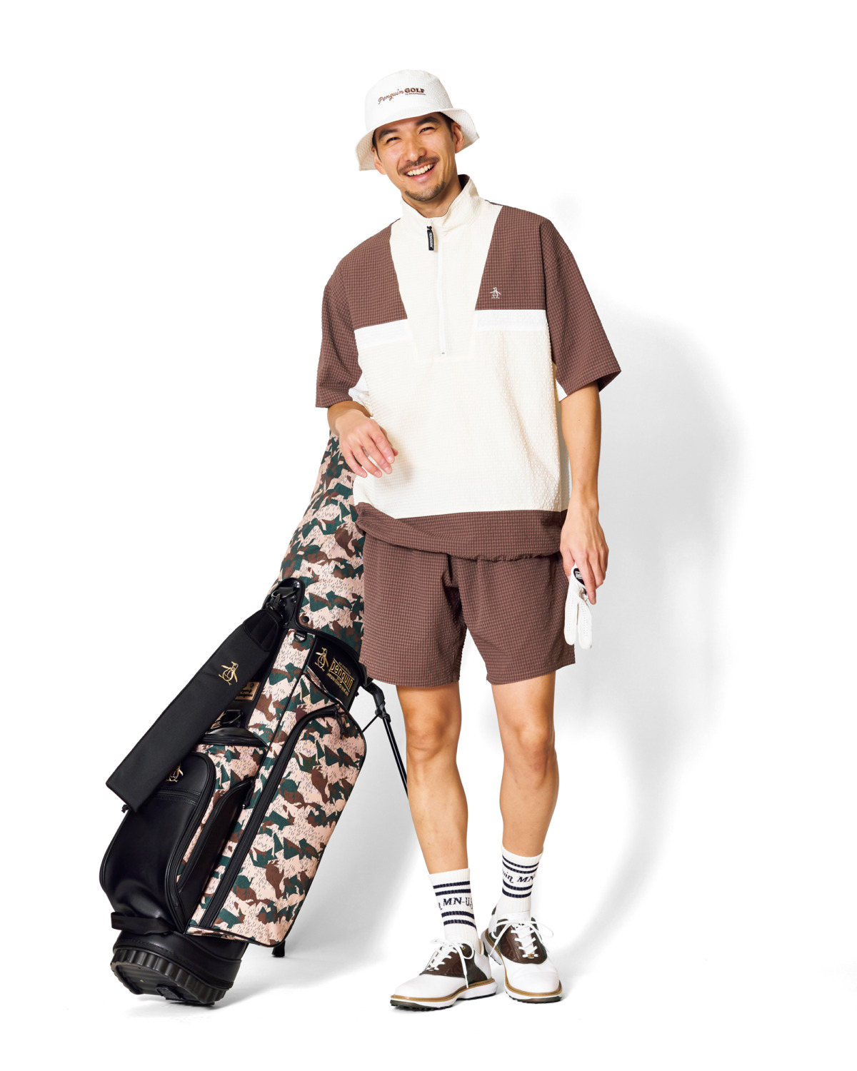 シャツ・ショーツ・バッグの3点で販売する「3点セットアップ」シリーズに、ハーフジップと切り替えデザインで90年代のスタイルを取り入れた新作が登場。ペンギンが隠れているカモフラ柄キャディバッグにも注目。ハット¥9,350、セットアップ¥28,600、2パックソックス¥5,280、キャディバッグ¥46,200(すべてペンギンバイマンシングウェア)、その他スタイリスト私物