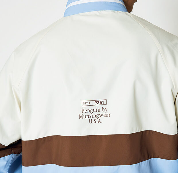 過去のアーカイブモデルのデザインを現代的な柄・パターン・シルエットで再構築したアイテムによるスタイリングは、爽やかなサックスブルーとブラウンの組み合わせで、クラシックでありながらスポーティな印象に。キャップ¥7,150、ブルゾン¥26,400、ポロシャツ¥16,500、パンツ¥20,900(すべてペンギンバイマンシングウェア)、その他スタイリスト私物